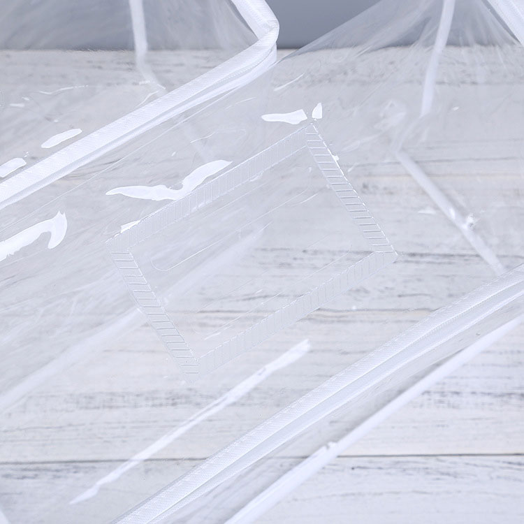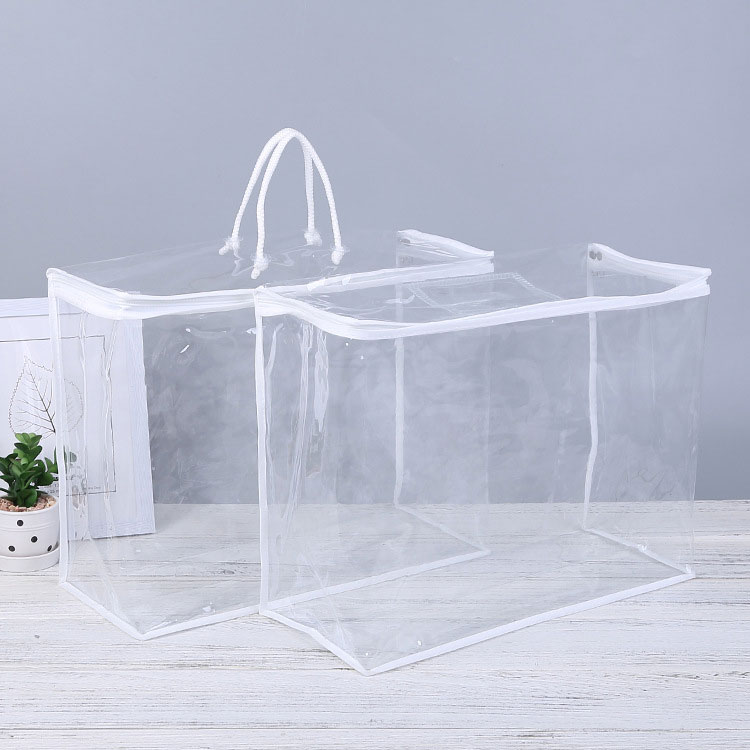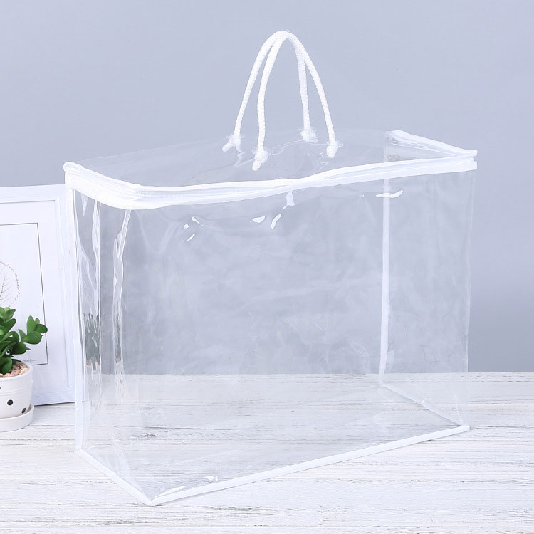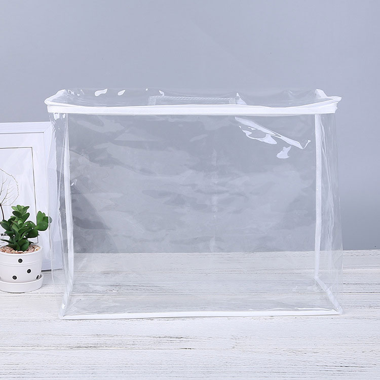 Mūsų PVC organizatorių krepšys Yra skaidrus ir pagamintas siuvimo mašina. Tai labai naudinga pakuojant patalynę. Medžiaga yra draugiška aplinkai, be aštraus kvapo ir netoksiškos. Jis yra pakankamai tvirtas, kad laikytų jūsų antklodes ar antklodes.